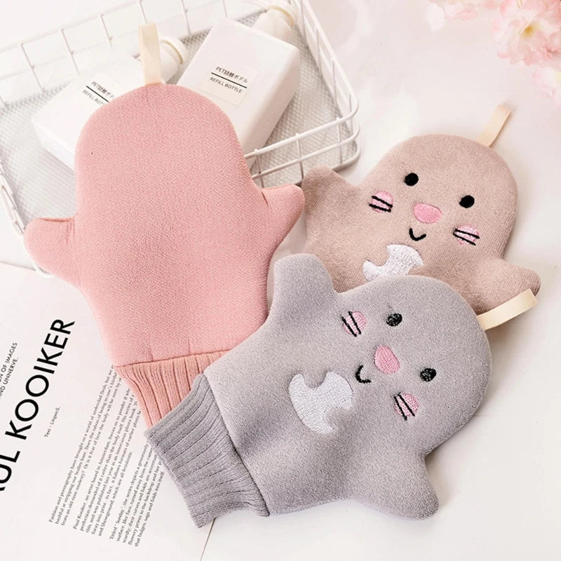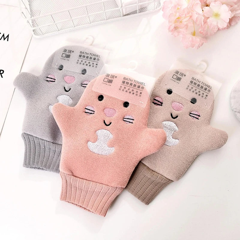 Le gant de bain est fabriqué dans une texture douce et absorbante, généralement en coton éponge ou bambou, qui respecte la peau sensible des tout-petits.